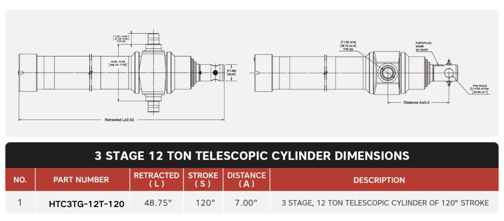 "HTC3TG-12T-120", 3-astmelised, 12 tonni 120" käiguga teleskoopsilindrid